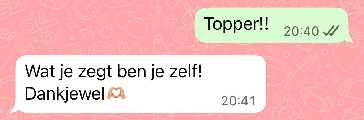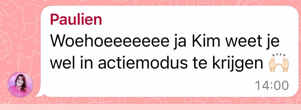Het contact is superfijn en snel. Kim is relaxed én on fire tegelijk (ik kan het niet beter uitleggen). Ze gaat als een speer en neemt je helemaal mee. Super motiverend (cheerleadervibes wel), met duidelijke uitleg over welke tools zin hebben (en welke vooral niet).